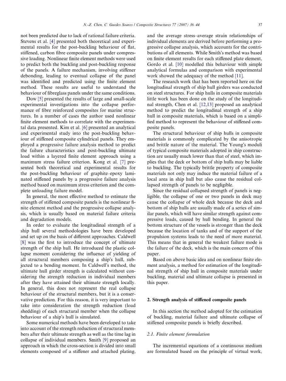 在这里报告的关于船体梁的纵向强度的研究工作是在钢结构上进行的。对于复合材料中的船体,对纵向强度的研究几乎没有做过工作,Chen等人[12,13]提出了一种预测复合材料船体纵向强度的分析方法,该方法基于简化的方法来表示复合材料板的性能。
