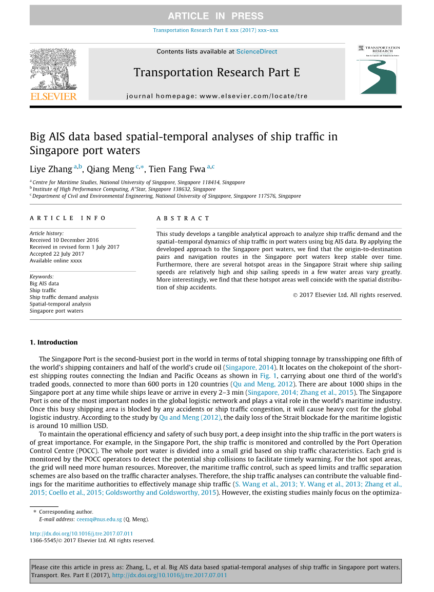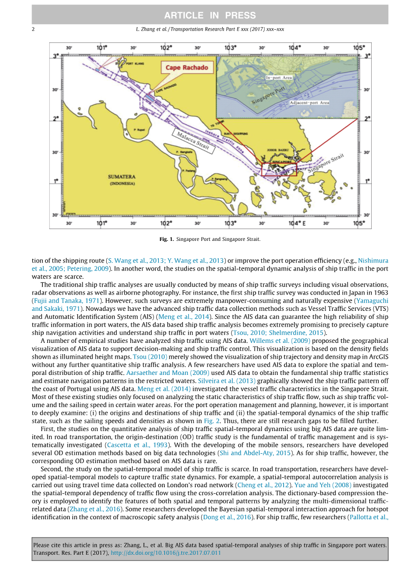 为了维持这样一个港口的运作效率和安全,深入了解港口水域的船舶交通至关重要。例如,在新加坡港,船舶的监管和调控由港口运营控制中心(POCC)进行。整个港口水域按照船舶交通特性被划分成一个个的小网格。每一个网格都由POCC操作员进行监测,可以发现潜在的船舶碰撞事故,有助于及时地发出警告。对于热点区域,这些网格区域需要更多的人力资源。此外,海上交通管制,就像限速和交通分离方案也是基于交通特性分析的。因此,船舶交通分析可以为海事机构有在效地管理船舶上提供有价值的发现(S. Wang等人,2013; Y. Wang 等人,2013; Zhang 等人,2015;Coello等人,2015; Goldsworthy和Goldsworthy,2015)。然而,现存的研究主要致力于船舶航线优化上(S. Wang 等人,2013; Y. Wang 等人,2013)。或者是提高港口运营效率上((例如,Nishimura等人,2005; Petering,2009)。换句话说,对港口水域船舶交通的时空动态分析的研究很少。
