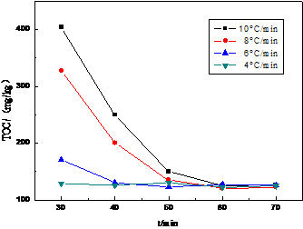In this paper,the high temperature treatment method is adopted for the chemical waste salt residue produced by a certain company.The method of high temperature treatment was used to control the parameters of heating rate,heating temperature, residence time, etc.The organic matter’s removal rate and TOC content of waste salt residue after treatment were used as evaluation indicators to optimize the technical parameters of high temperature treatment of waste salt residue.The high temperature treatment of chemical waste salt residue containing organics was carried out to reduce the content of organic matter.The best experimental conditions were obtained: the heating rate was 6°C/min,the heating temperature was 450°C,and the residence time was 50 minutes.The TOC of waste salt residue was reduced to 125 mg/kg,the removal rate of organic matter reached 96%,and the total mass of waste decreased by approximately 54%.Through infrared spectrogram analysis,comparing the changes of organics in raw salt and treated waste salt slag,it was initially confirmed that the organic matter achieved a better removal effect.