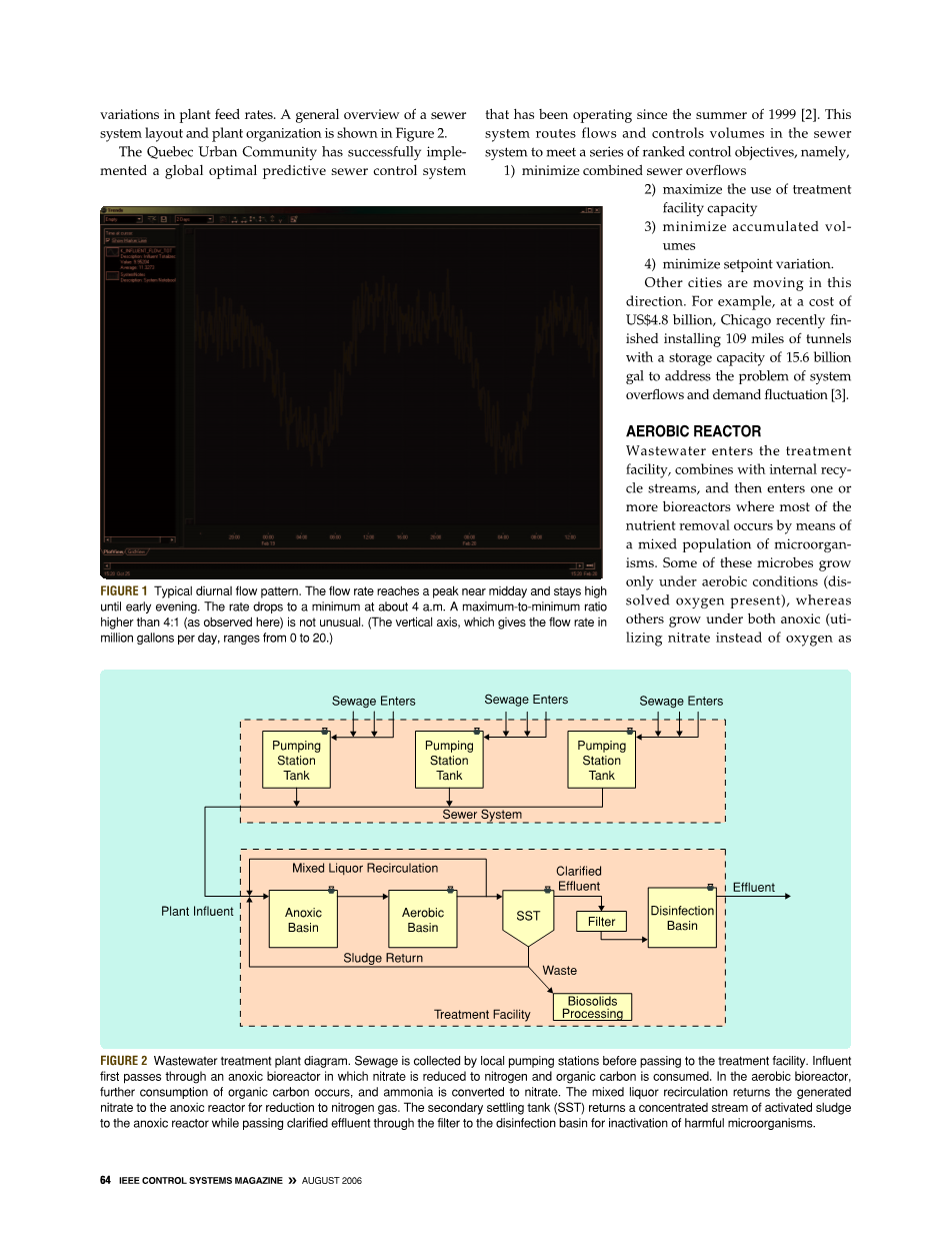 污水处理厂的第一个控制时机是调节进水流量。图1是人类活动的正常昼夜循环导致污水流量的日变化图。此外,雨水通过管道的裂缝(渗入)、人孔盖和其他开口(流入)进入下水道系统,导致流量激增。一种平滑流量变化的方法是在污水处理厂上游建立调节池。这种方法在处理工业废水的设施中很常见,但对于城市污水处理厂来说,通常过于昂贵。在某些情况下,组成下水道系统的管道和泵站内的固有储存空间被用来平滑植物进料率的变化。下水道系统布局和工厂组织的总体概况如图2所示。魁北克城市社区已经成功地建立了自1999年夏天以来一直运行的全球最优下水道控制预测系统。该系统对下水道系统的路线和流量进行控制,以满足一系列分级控制目标,即: