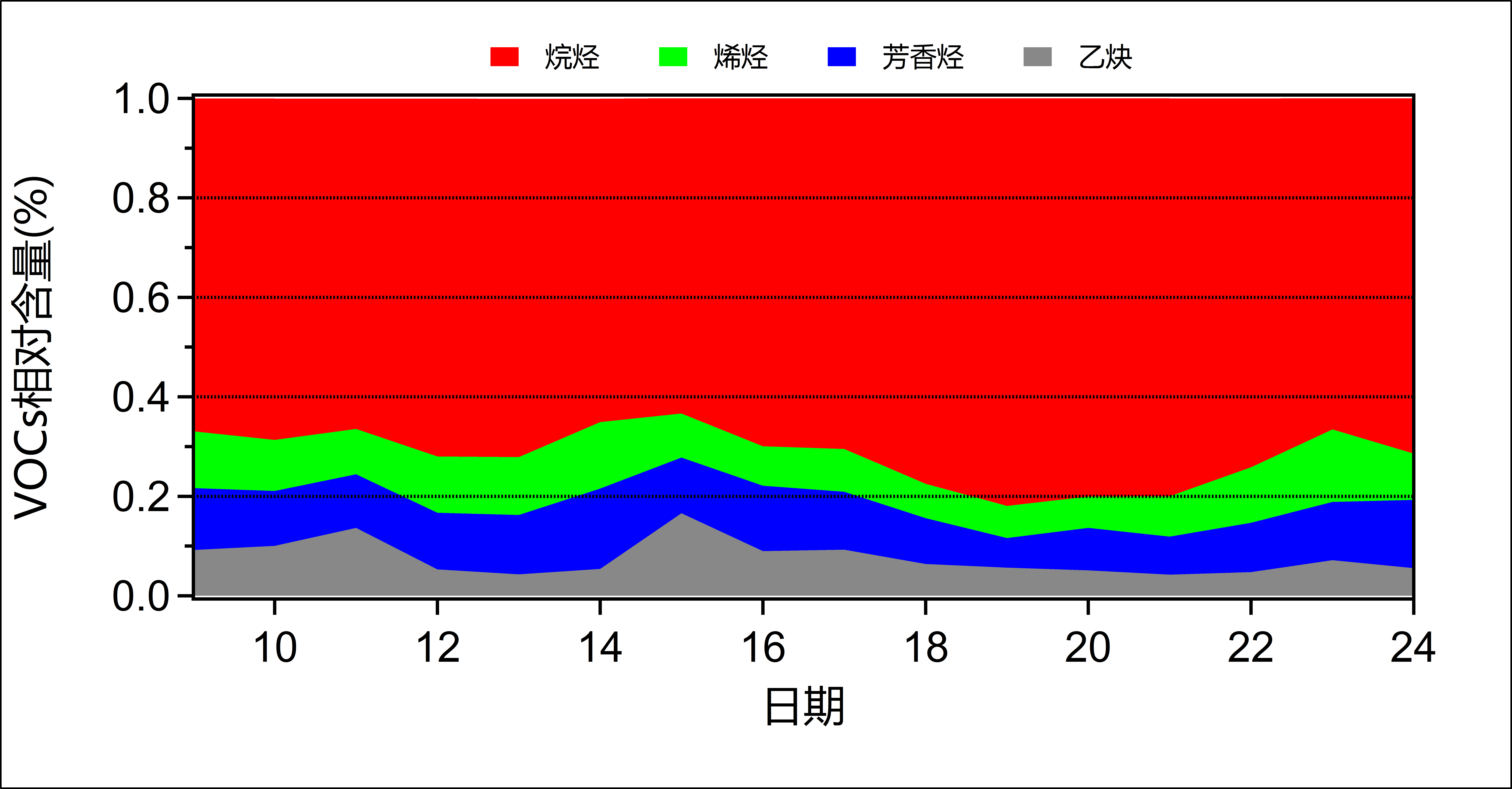 本研究于2018年4月9日至4月24日对深圳市的57种VOCs、臭氧、NOX进行了在线观测。观测结果表明,TVOCs的平均体积浓度为(14.25±7.04)ppbv。烷烃的平均浓度最高,其次分别为芳香化合物与烯烃,浓度最低为乙炔,分别占总体积浓度的71.6%、9.1%、11.1%及8.2%。臭氧与NO2平均浓度分别为(20.25±13.39)ppbv与 (15.82±4.71)ppbv。