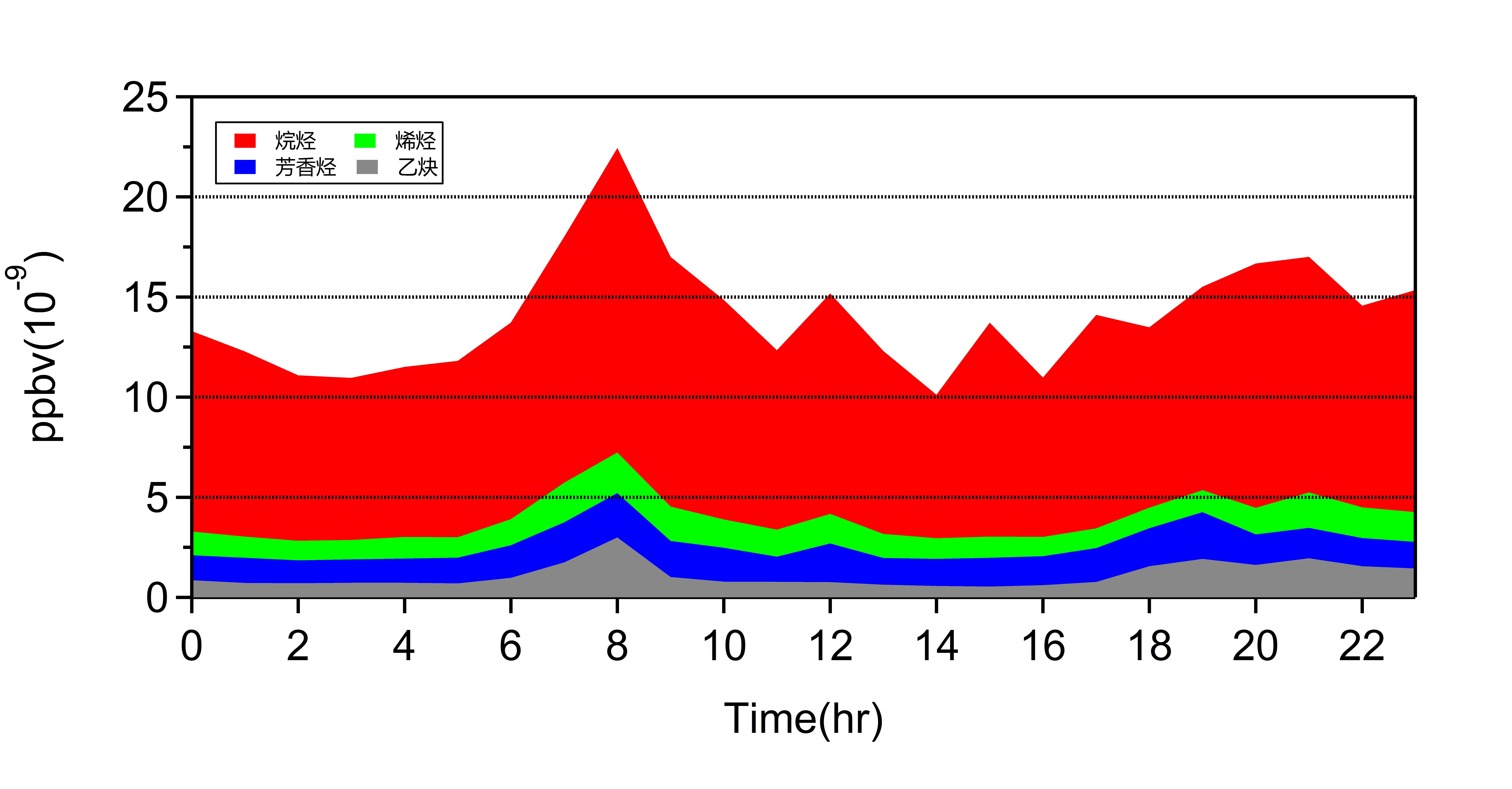 Besides, the study estimated on the atmospheric reactivity by the OH loss rate(LOH) and ozone formation potential. The total LOH was 2.22 s-1, 0.78s-1 for alkane,0.96s-1 for alkene,0.45s-1 for aromatic and 0.03s-1 for acetylene. In addition, OFP was 88.13μg/m3, 29.74μg/m3 for alkane, 22.96μg/m3 for alkene, 34.26μg/m3 for aromatic and 1.19μg/m3 for acetylene.