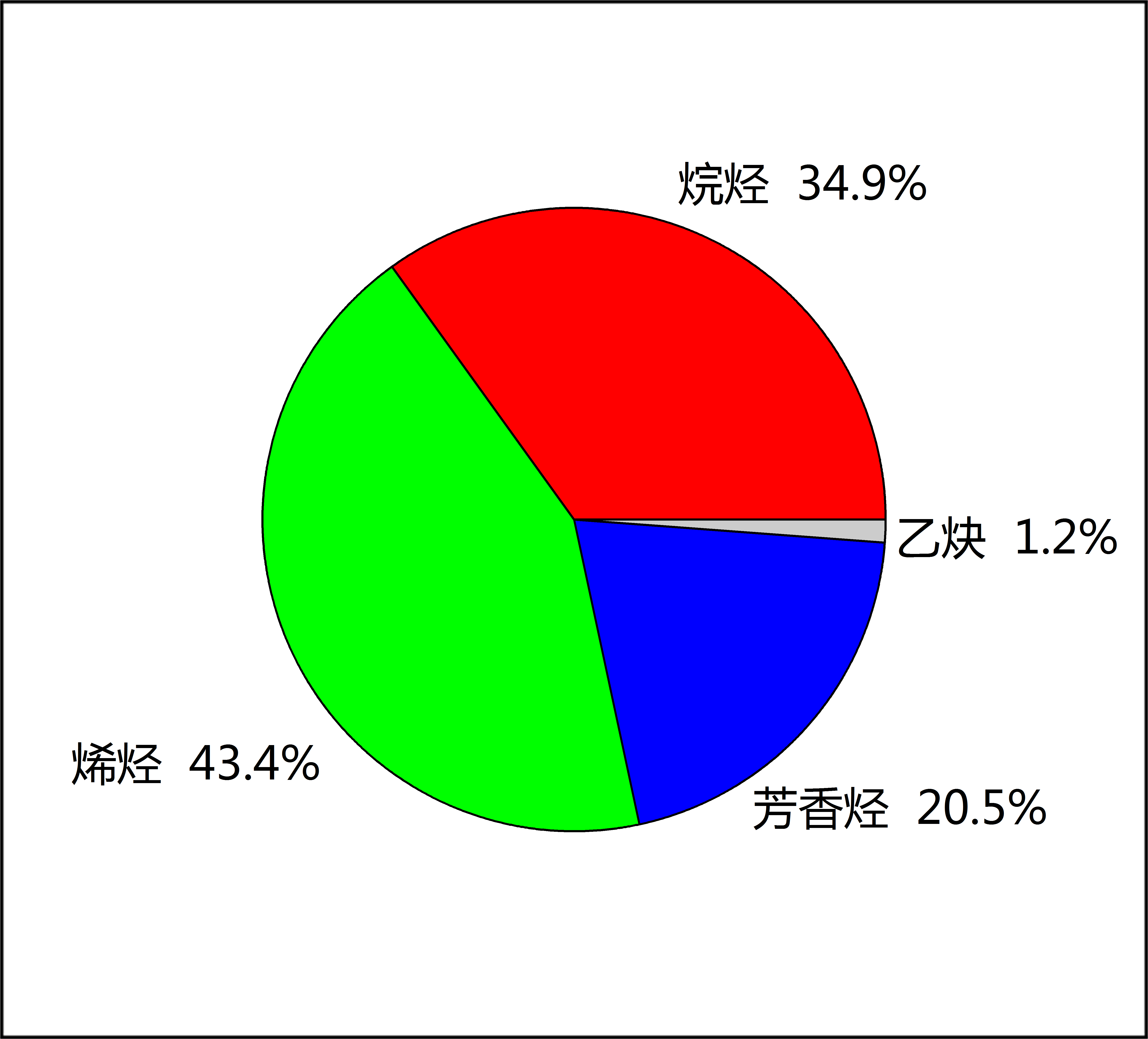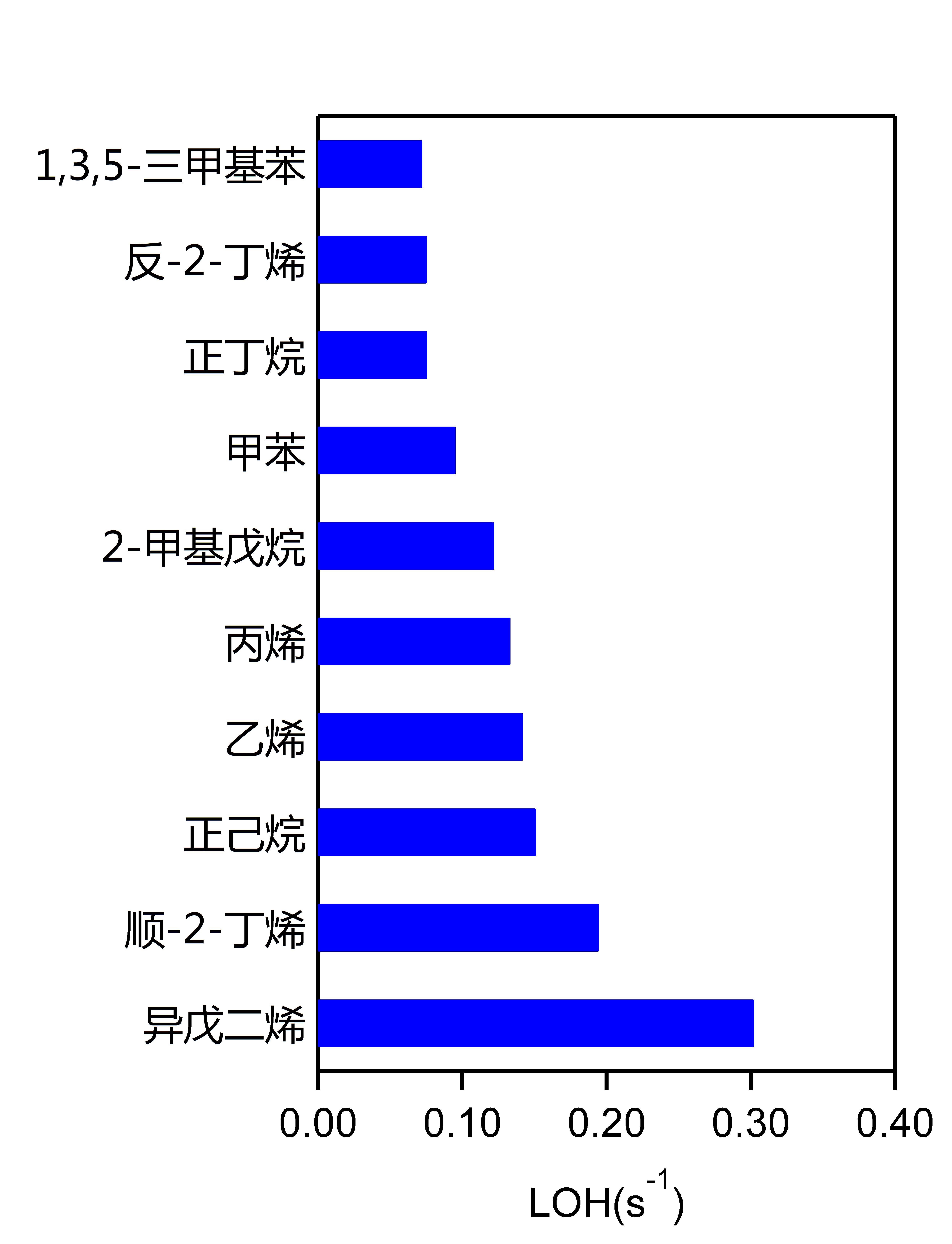 本文还对针对VOCs的反应活性,对OH消耗速率(LOH)与臭氧生成潜势(OFP)进行了研究。观测期间,OH消耗速率LOH为2.22s-1,其中烷烃、烯烃、芳香化合物、乙炔的OH消耗速率分别为0.78s-1、0.96s-1、0.45s-1以及0.03s-1。臭氧生成潜势为88.13μg/m3,其中烷烃、烯烃、芳香化合物、乙炔的臭氧生成潜势分别为29.74μg/m3、22.96μg/m3、34.26μg/m3、1.19μg/m3。