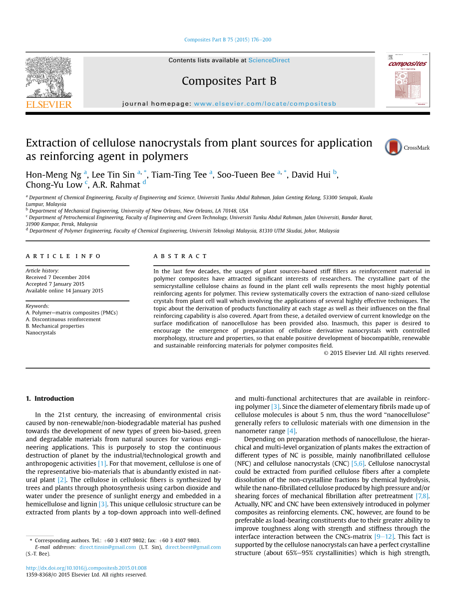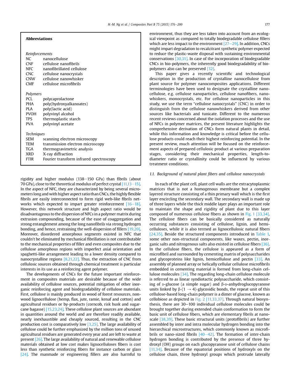 这篇论文对来源于植物、应用于聚合纳米复合物的纤维素纳米晶的生产进行了最新的科学和工艺的描述。不同的术语已经被用来指定纤维素纳米晶。例如:纤维素纳米颗粒,纤维素纳米纤维,纳米晶须,单晶体等。对这个研究中的纤维素纳米颗粒而言,我们使用术语CNC来同源于其他来源比如细菌和背囊内动物的纤维素纳米晶须加以区别。不同于许多最近有关NFC分离过程和它在聚合物中使用的回顾,当前文献详细地强调了源于自然植物的CNC的复杂来源,然而这个信息和知识在纤维素产品能达到它们最大的强化潜能以前是有待鉴定的。在现在回顾中,考虑到CNC的力学性能、长径比以及结晶度可能受不同处理条件的影响,许多注意力将会集中在不同处理阶段处理过的纤维素产品的强化方面。