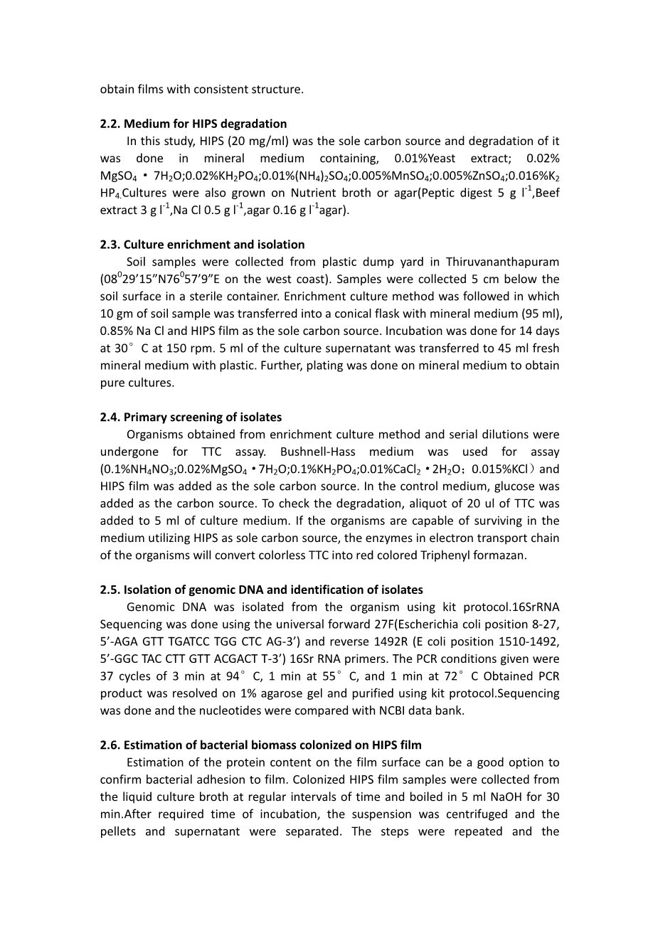 土壤样品是从提卢湾安塔普兰(Thiruvananthapuram)(西海岸的080 29rsquo;15” N760 57rsquo;9” E)的塑料垃圾场收集的。将样品收集在土壤表面以下5 cm的无菌容器中。然后采用富集培养法,将10 gm的土壤样品转移到以矿物培养基(95 ml),0.85%Na Cl和HIPS膜作为唯一碳源的锥形烧瓶中。在30℃,150 rpm下孵育14天。将5ml的培养上清液转移至带有塑料的45ml新鲜矿物质培养基中。此外,在矿物培养基上进行平板接种以获得纯培养物。