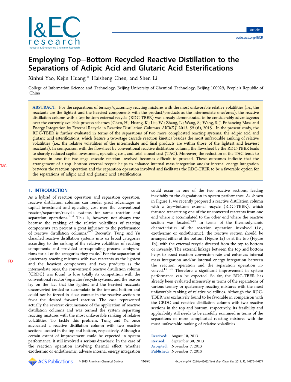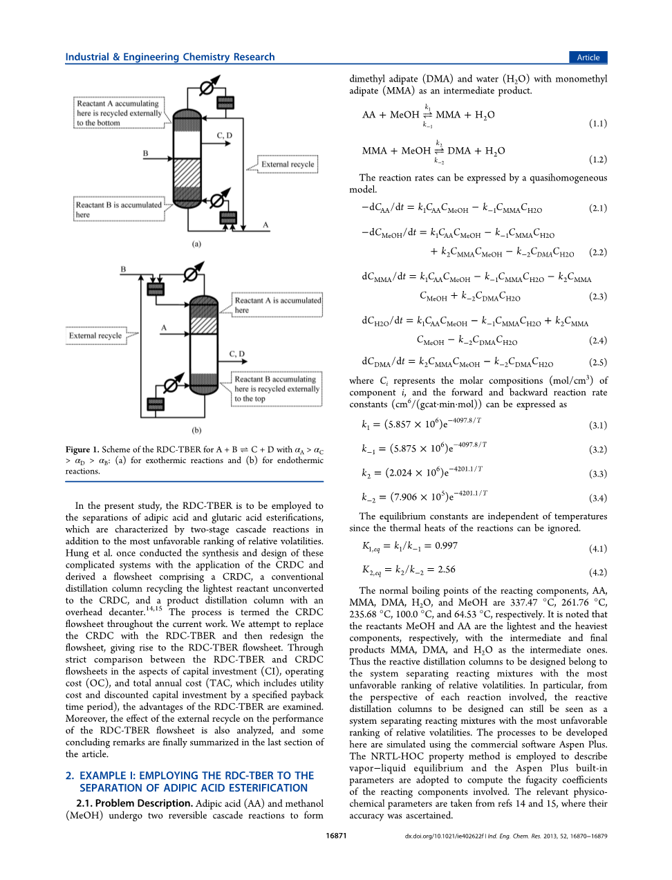 在本研究中,RDC-TBER将用于己二酸和戊二酸酯化物的分离,除了最劣相对挥发度序列外,其还具有两步串联反应的特征。Hung等人曾经在应用CRDC的情况下对这些复杂系统进行了设计,并得出了CRDC的流程:一个常规的精馏塔,该塔回收了未转化为CRDC的最轻的反应物,还有一个带有塔顶倾析器的产品精馏塔[14,15],该过程称为CRDC流程。我们尝试用RDC-TBER代替CRDC,然后重新设计流程,从而产生了RDC-TBER流程。通过严格比较RDC-TBER和CRDC流程在设备投资成本(CI),运营成本(OC)和年度总成本(TAC,其中包括指定回收期的公用事业成本和设备投资成本),验证了RDC-TBER的优点。此外,本文还分析了外循环对RDC-TBER流程性能的影响,并在文章的最后部分进行总结。