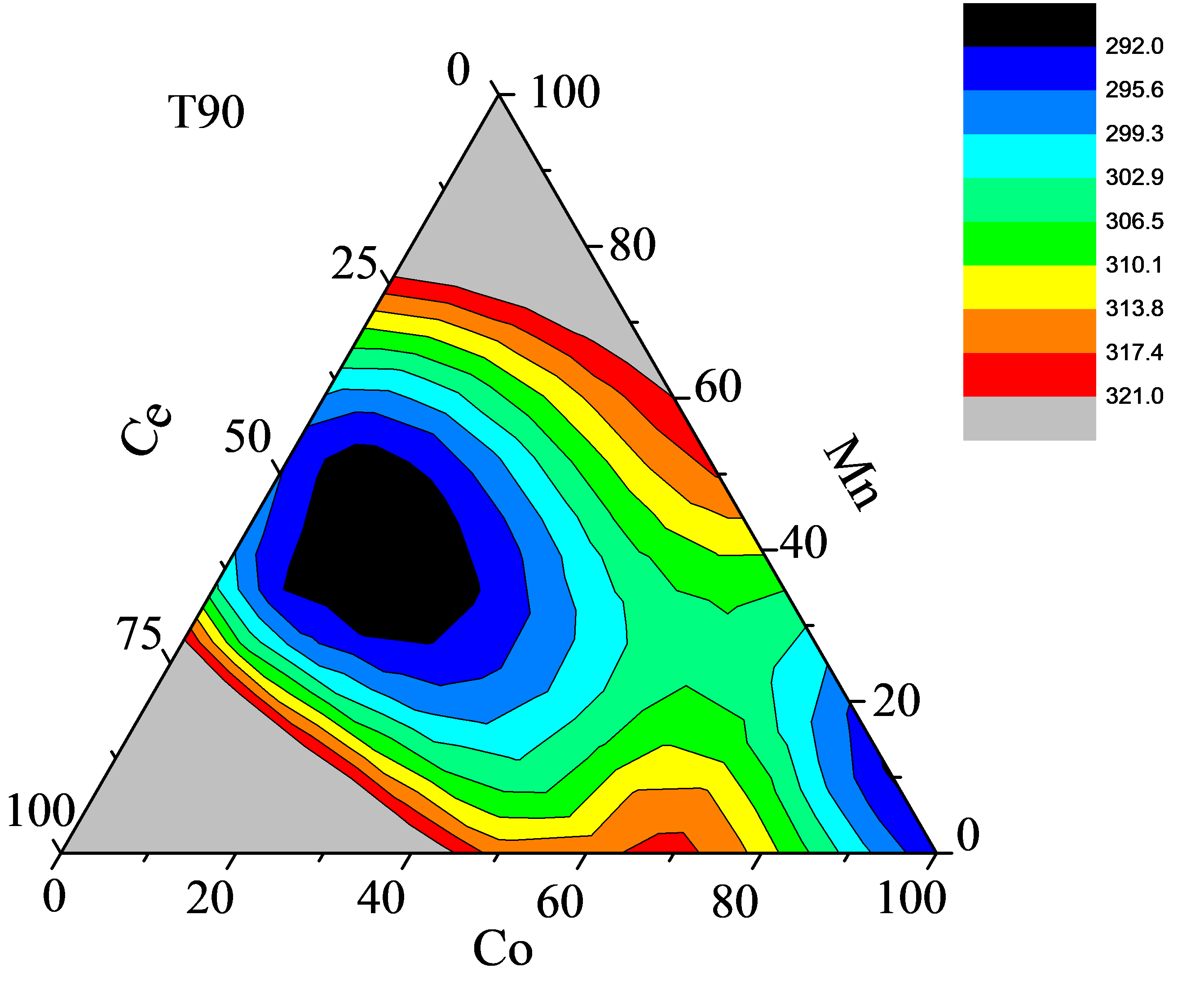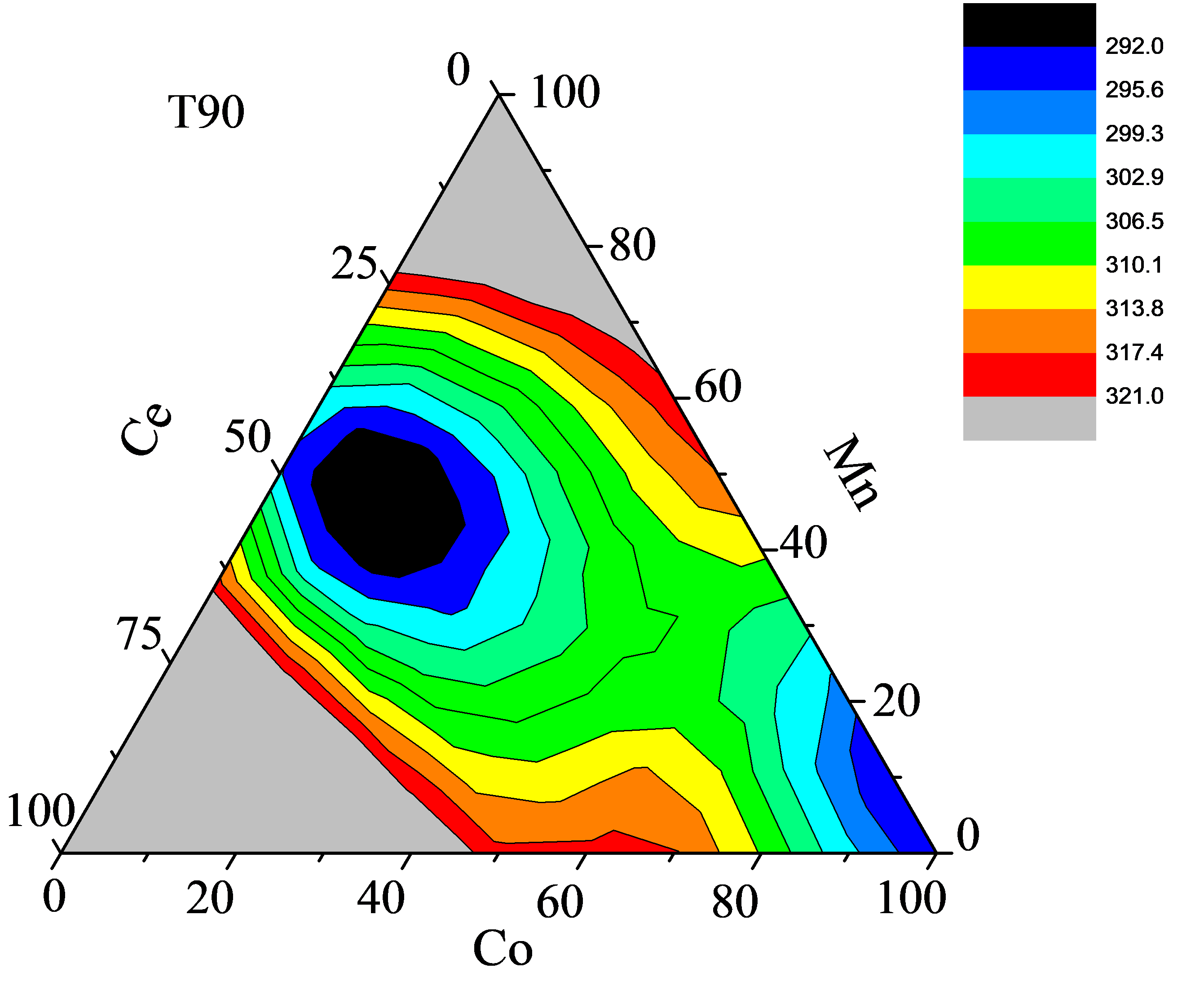 (3) in the process of studying the pH and hydrothermal temperature of the catalyst, it was found that there was a good correspondence between the particle size, specific surface area and T90 of the catalyst.the cobalt, manganese and cerium composite metal oxide catalyst was prepared under optimal conditions.
