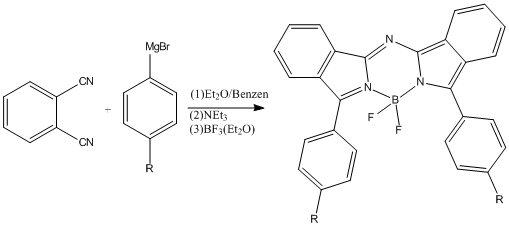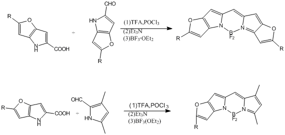 In this paper, terephthalic nitrile as starting materials, was reduced by sodium borohydride /nickel chloride to give p-xylylenediamine, p-xylylenediamine was methylated by formic acid /formaldehyde to produce N, N, N, N-tetramethyl-p-xylylenediamine, acetonitrile as solvent reacting with 6-bromo-hexanoic acid to give monoquaternary ammonium compounds; and then reacting with chloromethyl BODIPY gave crude bisquaternary ammonium compound containing BODIPY, the crude product was extracted with ether and washed, rotary evaporated, the resulting solid was separated by column chromatography to give the final product, and its structure was confirmed by H1NMR.