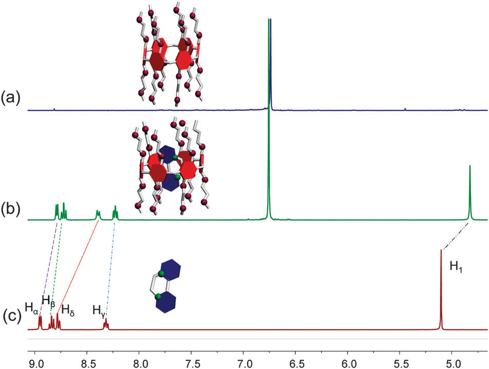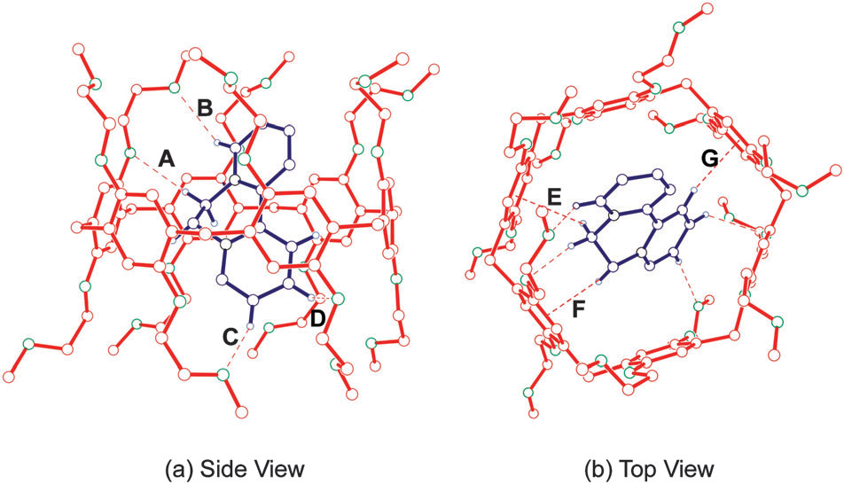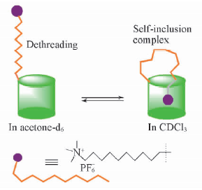 在2008年,奥苟斯和中本聪等人[4]发现了一种结构对称的柱芳烃,它是用对位桥联苯酚来形成的,而且它还是一种“柱”型的大环超分子主体化合物(图 a)。到目前为止,柱芳烃化合物主要是以五元和六元结构被合成出来的。在此,以五元为构造的柱芳烃化合物的空腔尺寸和α-环糊精(0.5 nm)差不多。柱芳烃特有的化学结构和空间结构,柱芳烃类似物拥有很多主体化合物的特点[4]。比如,它可以不经过复杂的修饰就能够识别出特定结构的客体分子,是因为它具有高度对称的结构并且其化学组成与杯芳烃类似物相类似;桥联苯环结构在其两侧有位点,并且非常容易就被修饰,比如羟基等,使它的化学修饰方法与环糊精相类似;它对客体分子的识别能力和葫芦脲差不多,并且制备和提存都非常方便。另外,柱芳烃具有的不同于其他烃类的溶解性质,使柱芳烃可以溶解在有机溶剂里并高效地进行主客体识别,有效地填补了已有主体分子比如葫芦脲等识别领域的研究。