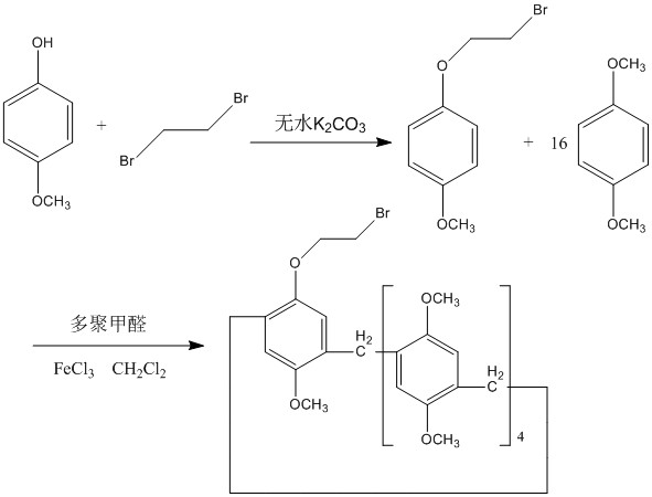 本论文以对甲氧基苯酚和二溴乙烷为起始原料,合成出的1-(2-溴乙氧基)-4-甲氧基苯与对苯二甲醚通过1:16的投料比并加入多聚甲醛,将其在氮气保护下加入二氯甲烷中合成出单溴乙氧基取代的柱[5]芳烃,并对其进行了核磁共振表征确证。