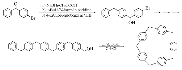 柱 [n] 芳烃作为研究中一类新型的主题分子,它是由对苯二甲酚或者苯二酚醚运用亚甲基桥在苯环的对位连接成的一类环状低聚物,它的构造与对位连接形成的环十分相似,是因为苄醇的线性五聚前体的端基制备合成的(合成路线见 图1.2.1)。利用这种相似的方法[5],可以制得环状六聚物是亚甲基对位连接的,但是从各项报告中报道出来的产率都不是很高,这是由于对位环番受到亚甲基桥键角张力的影响不能够稳定存在。
