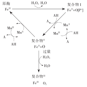 如图1.1所示,MnP的催化作用循环始于锰过氧化物酶中的Fe3 与H2O2或有机过氧化物结合形成铁过氧化物联合体,同时亚铁血红素上的2个电子转移到过氧化物的双氧键上,使其断裂释放出1分子H2O,并形成复合物Ⅰ。接着由1个鳌合的Mn2 作为电子供体将复合物工还原为复合物II,同时自身被氧化为Mn3 ,随后复合物II再被1个鳌合的Mn2 还原回原型完成该循环,放出2分子H2O2[20]-[21][22][23][24][25]