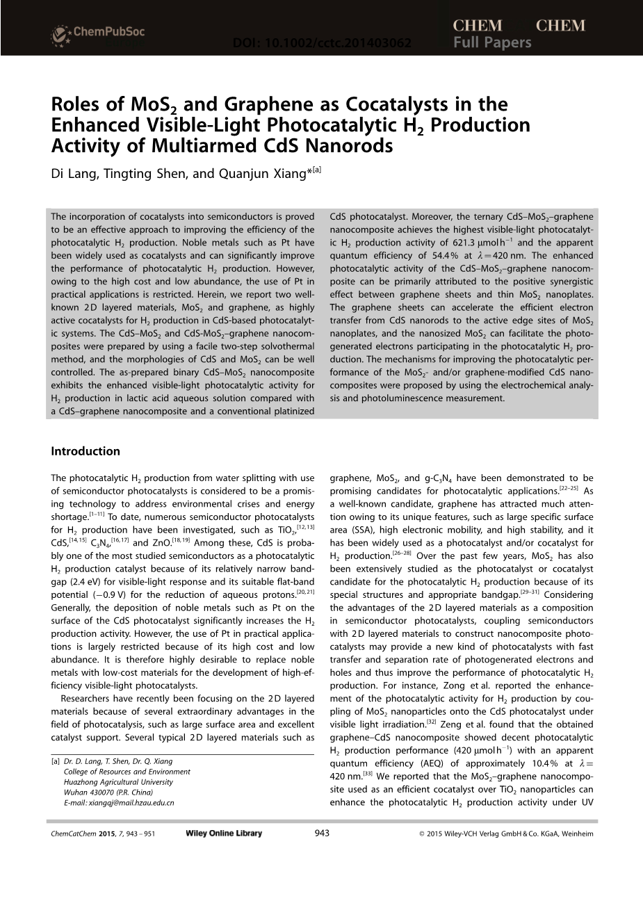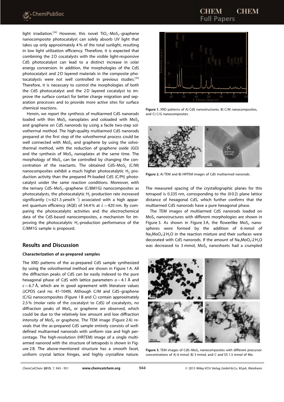 研究人员最近一直专注于2层分层材料,因为光催化领域具有很大的优势,如表面积大,催化剂支持性能优异。已经证明几种典型的2层分层材料如石墨烯,MoS2和g-C3N4是光催化应用的有希望的候选物。[22-25]作为一个众所周知的候选者,由于其独特的石墨烯,石墨烯引起了极大的关注特征如大比表面积(SSA),电子迁移率高,稳定性高,已广泛用作H2生产的光催化剂和/或助催化剂[26-28]近几年来,MoS2由于其特殊的结构和适当的带隙,光催化H2生产的光催化剂或辅助催化剂也被广泛研究。[29-31]考虑到2层分层材料作为半导体光催化剂组合物的优点,将半导体与2 D构建纳米复合光催化剂的层状材料可以提供具有快速转移和分离光生电子和空穴速率的新型光催化剂,从而改善了perf光催化H2生产的可能性。例如,Zong等报道了通过在可见光照射下将MoS2纳米颗粒结合到CdS光催化剂上来提高H2生产的光催化活性[32]曾等发现获得的石墨烯CdS纳米复合材料在l = 420nm处显示出显着的光催化H2生产性能(420mmol h 1),其表观量子效率(AEQ)为约10.4%。[33]我们报道,用作TiO2纳米颗粒上的有效助催化剂的MoS2-石墨烯纳米复合材料可以增强UV光照射下的光催化H2生成活性。[34]然而,这种新型TiO2-MoS2-石墨烯纳米复合材料光催化剂只能吸收仅占总阳光的约4%的紫外光,导致低的光利用效率。因此,预期将2D助催化剂与可见光响应的CdS光催化剂组合可以导致太阳能转化的显着增加。此外,复合光催化剂中CdS光催化剂和2层分层材料的形态在以前的研究中没有得到很好的控制[35]因此,需要控制CdS光催化剂和2 D层状助催化剂的形态,以改善表面接触,从而实现更好的电荷迁移和分离过程,并为表面化学反应提供更多的活性位点。