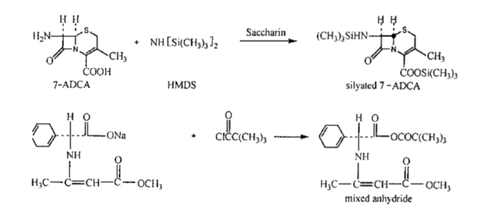 最终步骤为(图2.2.3):将所混合的酸酐温度降低到负四十摄氏度,与此同时,也要把7-ADCA硅酯的温度降低到0摄氏度,并将7-ADCA硅酯加入到酸酐溶液中,维持零下三十摄氏度到零下五十摄氏度的温度,充分反应三个半小时。再将其混合溶液放到具有高浓度的盐酸中进行水解反应,接着分离出水相,投入活性炭吸收杂质。将乙腈投入至上一步所得液体中,保持5℃,再缓慢加入25%氢氧化钠溶液调至pH=5,进而出现白色结晶,0~5℃缓慢搅动[10]。