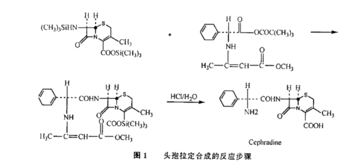 随着环境恶化、微生物种类增多、细菌耐药性出现、疾病的发展,人类对抗生素的需求量的持续增加,抗生素的市场空间在不断攀升。头孢拉定(结构式见下图)又称头孢环乙烯、头孢雷定、先锋霉素Ⅵ、头孢菌素Ⅵ,因其可以口服、吸收好、血药浓度较高、药效好,对临床耐药性金葡菌及多种耐药菌有良好的杀伤作用,且价格合理,目前是临床常用的抗菌消炎药[1]。头孢拉定在临床上对于治疗葡萄球菌、肺炎球菌、大肠杆菌、肺炎菌等致病菌所造成的诸多炎症有比较好的疗效。主要用于葡萄球菌、链球菌、肺炎球菌、大肠杆菌、肺炎菌、痢疾杆菌、沙门菌等引起的泌尿道 、呼吸道、消化道、皮肤软组织、耳鼻咽喉感染及妇产科感染,如支气管炎、膀胱炎、肾盂肾炎、肠炎及痢疾等。并且,该药在预防治疗术后感染中也起到重要的作用[2]。