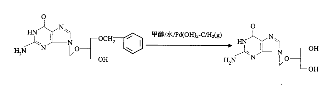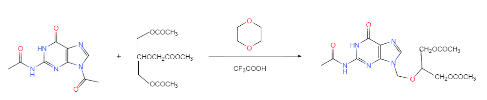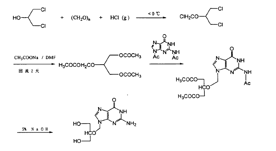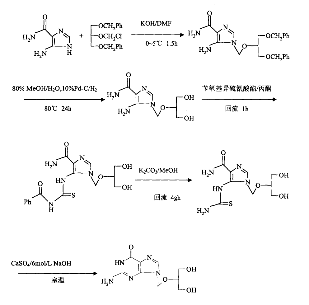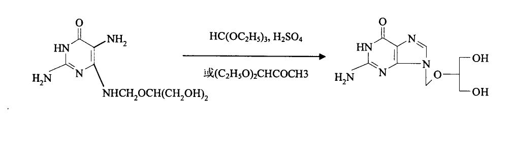 This design refers to domestic and foreign literature reports in recent years, through the 2,9-diacetyl guanine as raw material, and [(2-acetoxy-1-acetoxymethyl)-ethoxy] methyl acetate after the condensation reaction produces N2-acetyl-N9-[(1,3-diacetoxy)propan-2-yloxymethyl]guanine, which is then treated with a solution of methylamine to give a product of higher purity. With the advantages of easy access to raw materials, mild reaction and high yield, it is suitable for industrial production.