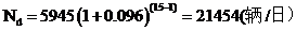 交通量换算的标准车型为小客车, 折合成小客车后的起始年平均日交通量N0=5945辆/日,预测的远景年平均日设计交通量为: