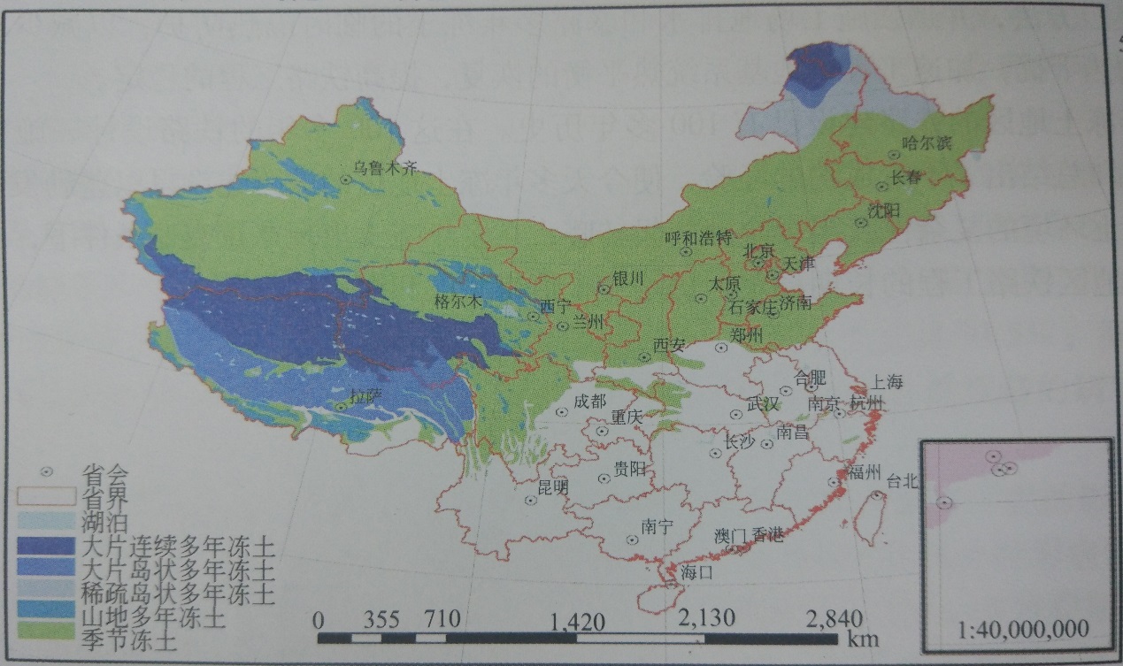 在世界的范围内我国的冻土面积很大,终年冻土面积约215万km2,在世界排第三位,其中,位于高海拔的冻土的面积居世界第一位,冻土主要分布在高山区如松嫩平原北部、西部高海拔的青藏高原、大小兴安岭和梦姑高原。如图1.1为我国多年冻土类型与分布图[[1]]。