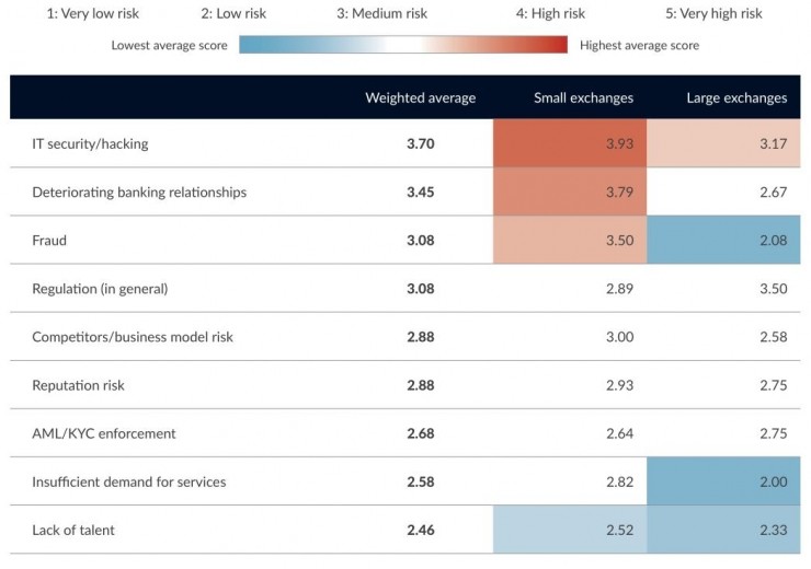 就风险评估方面而言,对于交易所来说,最大的风险来自于网络安全问题,他们必须时刻警惕黑客入侵的事件。接下来第二位的是“和银行业日益恶化的关系”问题,第三位是诈骗行为。