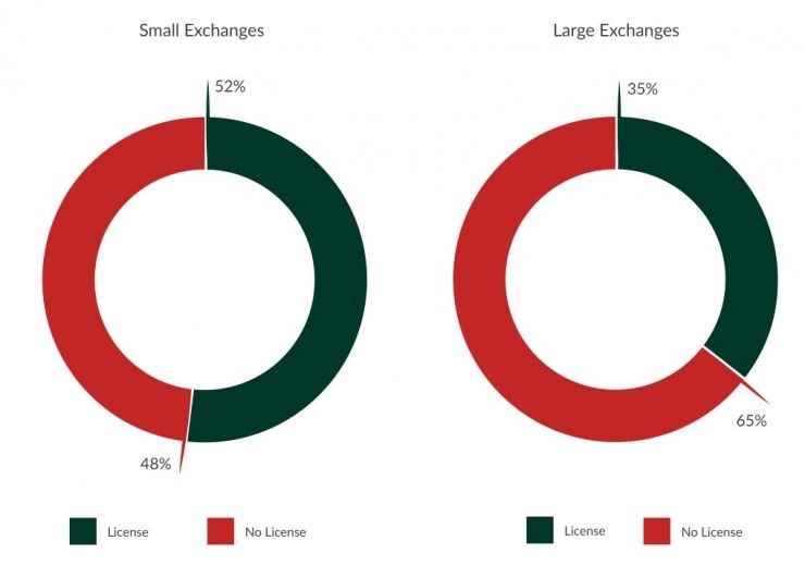 截止目前,所拥有政府颁发的相关执照的大型交易所只有35%,小型的也不过35%,可见当前市场上的虚拟货币交易所大多为非正规经营,这也是虚拟货币交易平台非法事件频发的一个重要原因。