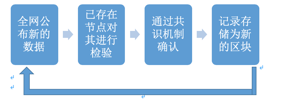 具体讨论到区块链的运作模式,区块链是由众多的节点构成的,当一个新的节点出现的时候它包含了许多新的信息打包成块,然后全网的其他已存在的节点接收到新的节点后,就检验它的真实性,合法性,算法正确性。检验通过之后,区块链独有的共识机制对它进行审查合格之后就记录为一个区块。详细的区块链工作过程由图2.1所展示。