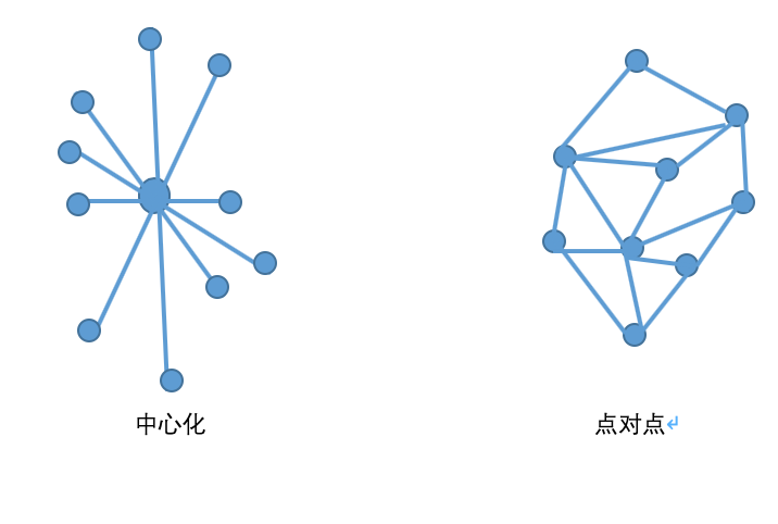 去中心化是指区块链不根据中央统一管理,数据由每一个已存在的节点进行检查监督,在没有第三方信用背书的情况下,数据自我维护、自我记录、自我更新,实现了真正的分布式记录。全网的数据更新都依照共识机制的规则来进行评判。每一个节点数据都互为担保,通过图2.2来区别一下中心化和点对点去中心化的概念。
