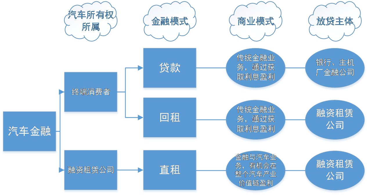 汽车零售金融市场从业务模式来看分为贷款、回租和直租,其中回租的模式类似于贷款,汽车所有权均属于终端消费者。所以我们主要研究的对车贷平台的业务模式为贷款和回租。贷款类中,银行和金融公司是主要的玩家,占据绝对主流。在回租方面,主要由融资租赁公司开展。目前回租相较于直租占比更大,但未来受监管收紧。