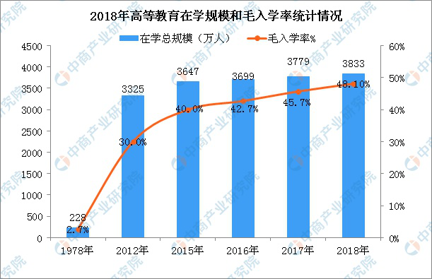 从上图可以看出,高等教育在校学生人数每年都在不断增长,高等教育毛入学率也呈现上升的趋势,这标志着我国高等教育取得了有效的成绩。