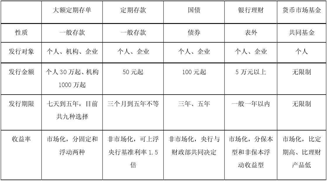 在过去,由于我们的金融市场是刚起步阶段,市场环境不成熟,国家必须高度管控,因此银行间无法做到完全自由竞争。摸索阶段,金融产品创新力度不够,即产品同质化比较厉害。现阶段,商业银行都在渐渐的改变部分经营模式,同时重启大额存单业务,必将促进商业银行的发展。下面的表格罗列出了大额存单和其他金融产品的差别对比。