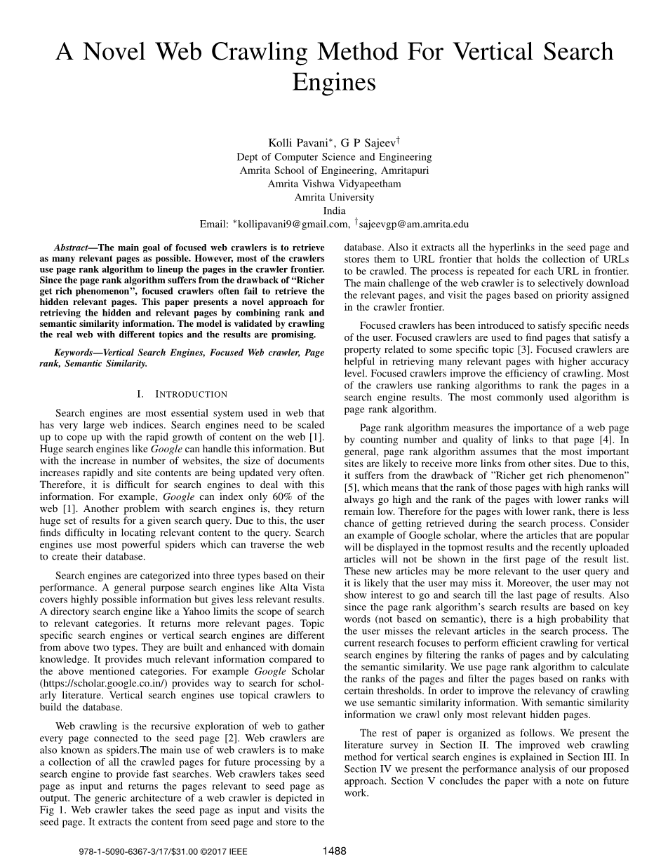页面排名算法通过计算到该页面的链接的数量和质量来衡量网页的重要性[4]。通常,页面排名算法假设最重要的站点可能从其他站点接收更多链接,由于这个原因,它遭受了“富裕者更富裕现象”[5]的缺点,这意味着那些排名较高的页面的排名总是很高,排名较低的页面的排名将保持较低。因此,对于排名较低的页面,在搜索过程中就会导致获取检索的可能性较小。考虑一下Google学者的例子,其中受欢迎的文章将显示在最顶层的结果中,并且最近上传的文章将不会显示在结果列表的第一页中,这会导致用户查询中用户很可能会错过这些新文章。此外,用户可能没有兴趣去搜索直到结果的最后一页。并且,由于页面排名算法的搜索结果基于关键词(不基于语义),因此用户很可能错过了搜索过程中的相关文章。目前的研究重点是通过过滤页面的排名和计算语义相似性来对垂直搜索引擎进行有效的爬行。我们使用页面排名算法来计算页面的排名,并基于具有特定阈值的排名来过滤页面。为了提高爬行的相关性,我们使用语义相似性信息,从而通过使用语义相似性信息,我们只抓取最相关的隐藏页面。