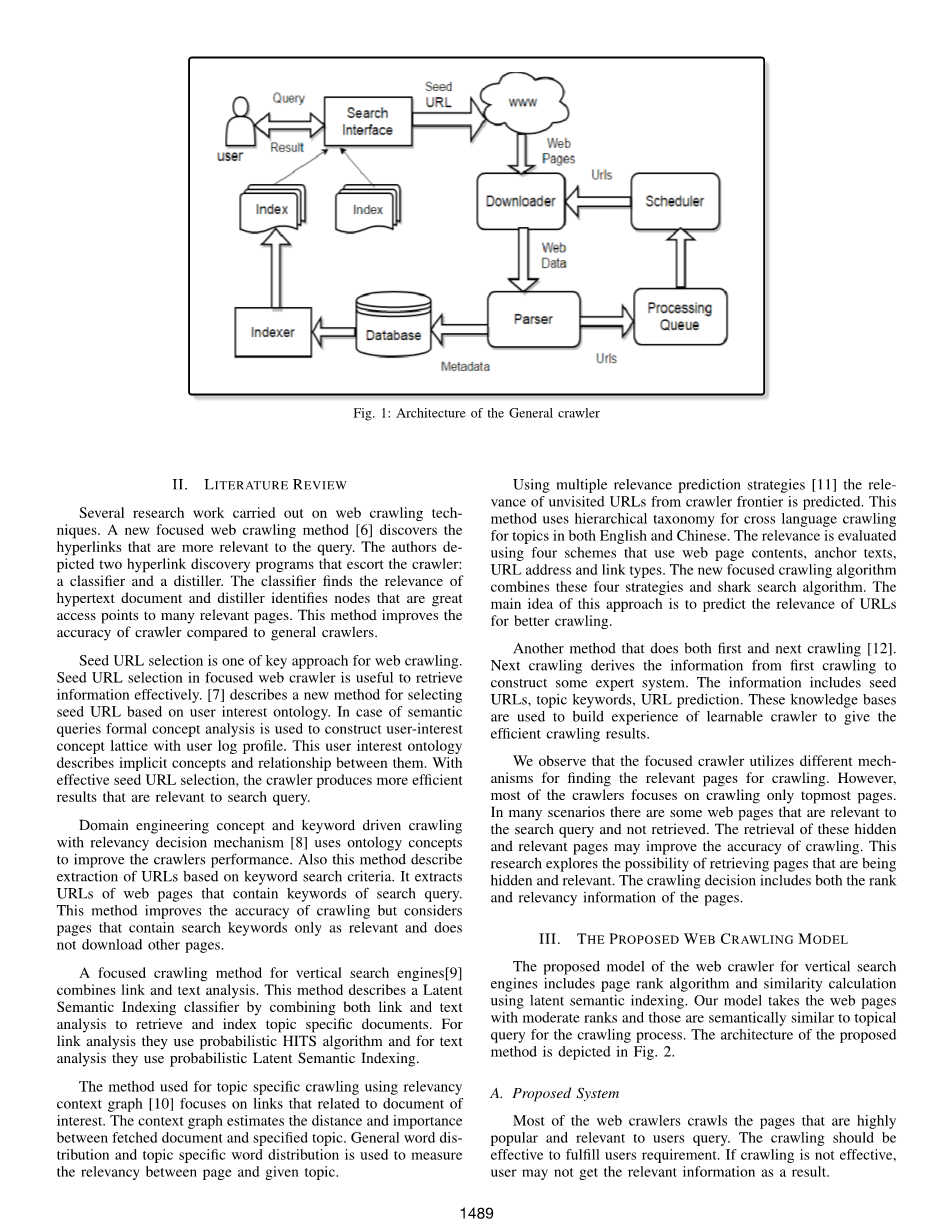 所提出的用于垂直搜索引擎的网络爬虫的模型包括页面排名算法和使用潜在语义索引的相似度计算。我们的模型采用中等排名的网页,这些网页在语义上类似于爬网过程的主题查询。所提出方法的架构如图2所示。