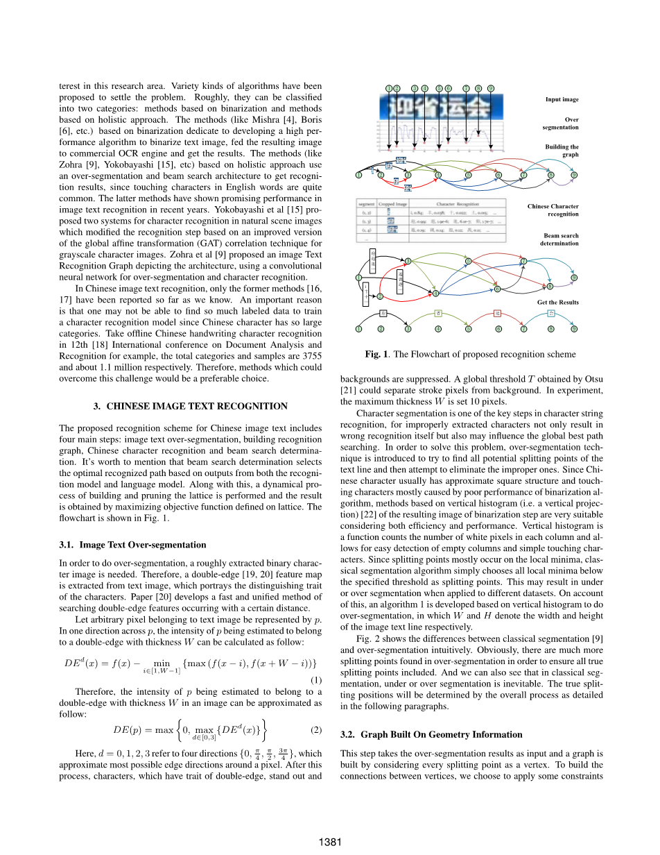 中文图像文本识别的另一个挑战是分割(即将文本行的图像分割成与单个字符相对应的片段),因为相当一部分汉字是在左右两侧分离的结构中。此外,由于性能不佳的二值化算法导致的触摸字符也会导致更多的不正确提取字符,这些字符通常无法用当前使用的方法正确识别。为了解决这些问题,本文介绍了一种过度分割技术,该技术广泛应用于手写体汉字串识别[7,8]和英文文本识别[9]。它试图在文本行的图形表示中找到所有潜在的拆分点,然后尝试消除不正确的拆分点。
