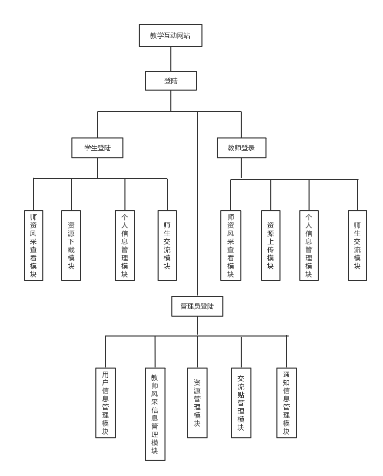 根据需求分析,可以将整个教学互动网站系统分为三大模块,分别是教师功能模块,学生功能模块和管理员功能模块。其中教师功能模块包括登陆模块,师资风采查看模块,资源上传模块,个人信息管理模块,师生互动模块;学生功能模块主要包括登陆模块,师资风采查看模块,资源下载模块,个人信息管理模块,师生互动模块;管理员功能模块包括,管理员登陆模块,用户信息管理模块,教师风采信息管理模块,资源管理模块,交流贴管理模块,通知管理模块。系统结构图如图3.1所示。