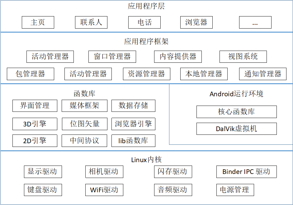 该层是由运行在Dalvik虚拟机(一种专门用于Android的Java虚拟机)上的,由Java语言编写的应用程序组成,而Android系统上一般有捆绑一些自己的核心应用程序,如联系人、地图、日历、浏览器等。