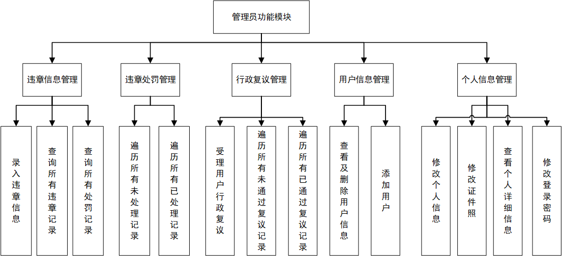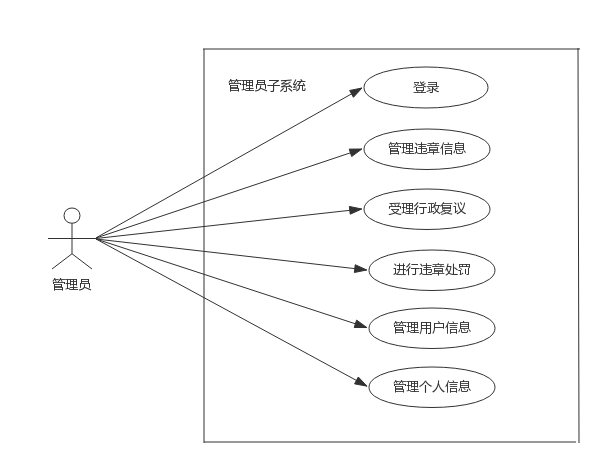 本系统主要偏向于管理员的功能,管理员通过警号和密码来登录进入管理员系统,可以在系统里录入和管理违章记录,对违章记录进行处罚,对用户行政复议申请进行管理,对用户信息进行管理以及对个人信息进行管理。管理员模块用例图如图3.1所示。