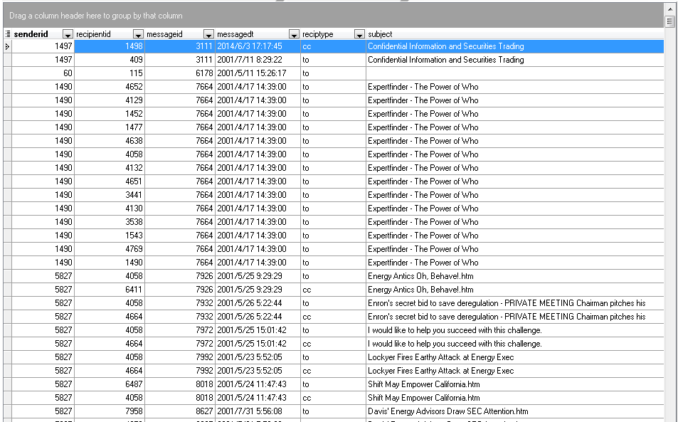 在目前已知的电子邮件的相关研究中,使用得最多的公开数据集便是安然邮件数据库,它的由来是出自的邮件数据是安然公司(Enron Corporation)中的150位高级管理人员的往来的邮件,至于为什么会暴露出来,是因为当安然公司在接受美国联邦能源监管委员会调查时这些邮件也随着被公布到了网上[5]。