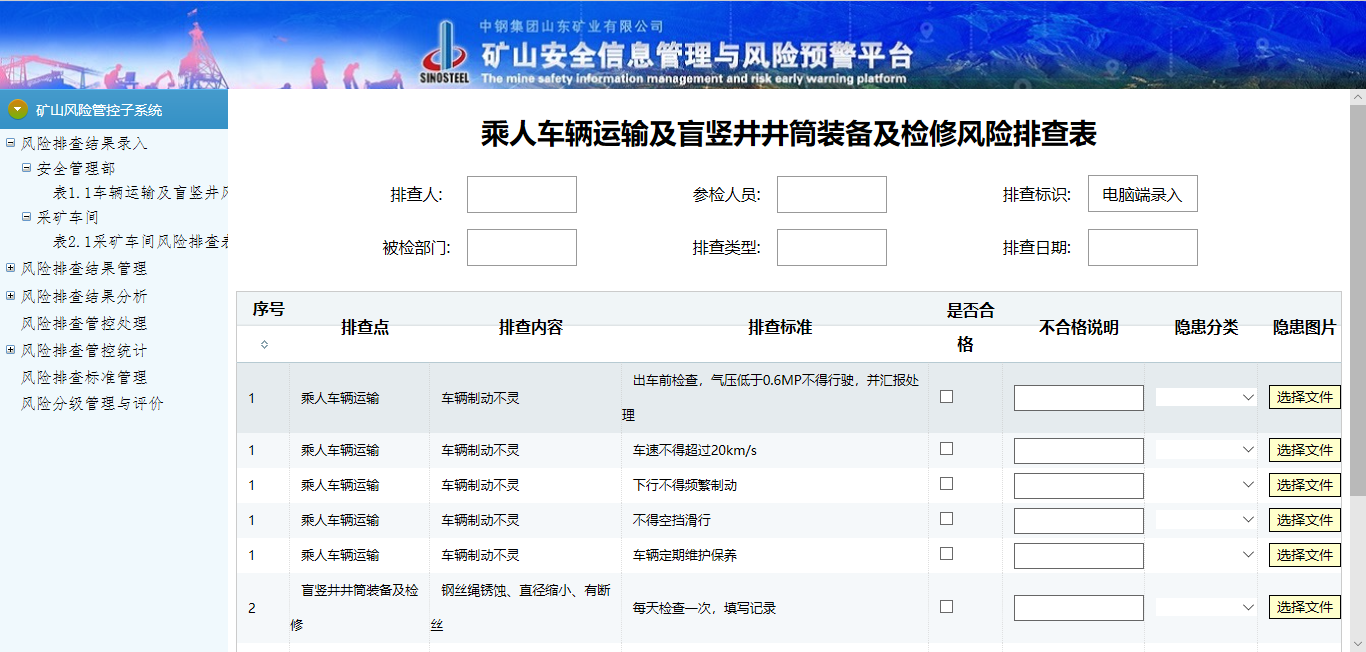 目前矿山风险管控主要存在的问题有:检测仪器落后、工作量大、费用高、排查复杂且耗时长。为全面、快捷地排查矿山安全状况并对存在的风险隐患实时预警,从而,确保矿山安全正常运营,本文吸收和借鉴已有的风险管控系统,结合山东矿业公司安全生产的特点,围绕其实际需求展开,以现有安全生产标准化工作文件为指南,以实现安全信息工作的科学化、规范化、现代化以及前瞻性管理为目标,实现安全文明生产全方位的管理。矿山风险预警系统中,排查人能够在电脑端输入矿山各项排查数据信息,通过对比标准数据,达到对矿井进行风险监测的目的,建立快速反应的矿山风险预警系统,为矿山安全管理决策提供快捷和科学的决策信息,及时预测和控制事故、减少事故损失。利用计算机编程实现矿山风险预警,可以实现在危险发生前向矿山相关部门发出预警信号、报告风险隐患情况、提醒操作人员进行隐患排除并重新进行风险排查的功能,从而避免危险事故的发生,最大程度地减低隐患所造成的损失。