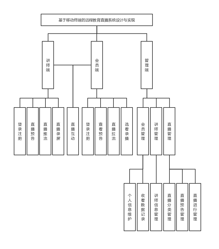 远程教育直播系统的主要目的在于通过网络直播技术解决传统实体课堂教育上时间及空间受限导致的资源分配不均匀问题,并提供公平资源共享及可靠的实时交互。该系统的主要功能包括:视频直播管理、视频点播管理、讲师与会员管理、讲师讲课预告会员。该系统的功能模块主要分为三端,分别为:管理端、讲师端和会员端。如下图所示。