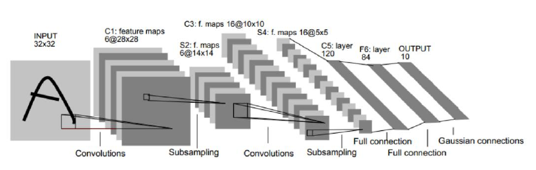 这个课题的基础是改进LeNet-5的模型,在池化层、全连接层以及输出层等进行数据的调整以达到目的。而在训练时,要对网络中的所有权重和偏置随机初始化,使模型能正常地进行后续的迭代训练。然后是多次前向传播和反向传播过程的迭代,每进行一次该过程都会将上一次迭代生成的权重和偏置全部刷新。在完成设置次数的迭代训练后,将最终生成的各层权重和偏置保存到数据文件中,以便在实时的数字识别中省去长时间的训练过程,达到识别目标的准确性、稳定性和快速性。[8]
