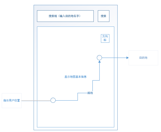 用户在进入导航APP后,最先看到的是地图的主界面。主界面主要显示用户的位置定位以及基础的地图信息,在用户的位置标记上还标记出用户正对的方向以便用户对于方向的判断。主界面的上方,设置一个搜索框作为用户输入的接口,用户通过搜索框搜索目的地。搜索框右边绑定查找按钮,用户点击查找按钮,系统找到对应的有可能是目的地的地名并显示,用户选择后系统在地图界面将目的地位置标记出来。用户可以选择查看通往目的地的路径以及可供选择去往目的地的方式。其中包括步行、驾车等等。系统在主界面显示路线,显示需要的大概路程以及时间。