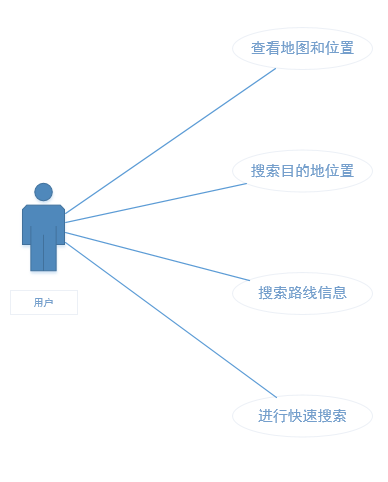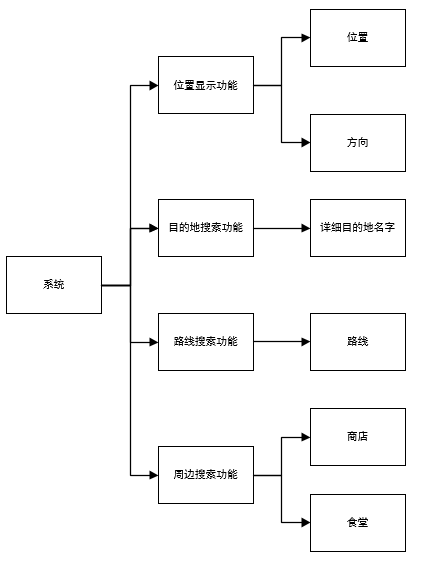 本次实现的地图导航系统主要包含有查看地图信息和自身位置信息,搜索目的位置信息,搜索路线信息,周边快速搜索四个动作,对应上文所述的四个主要功能,如图2-2所示。