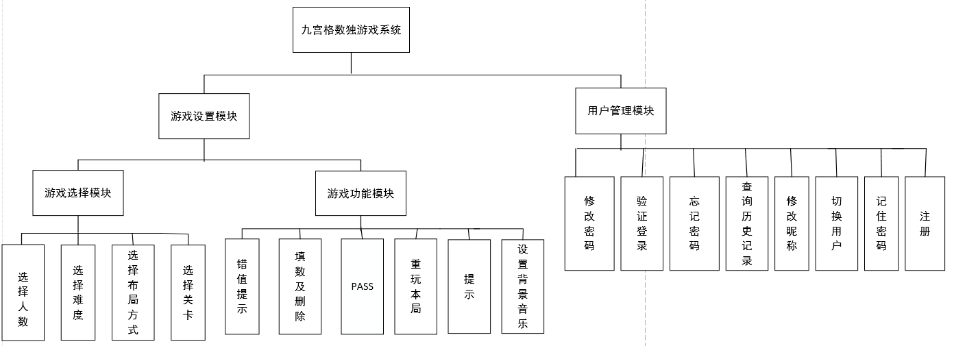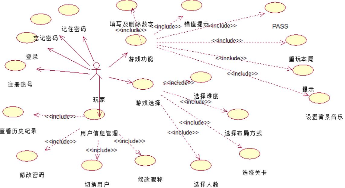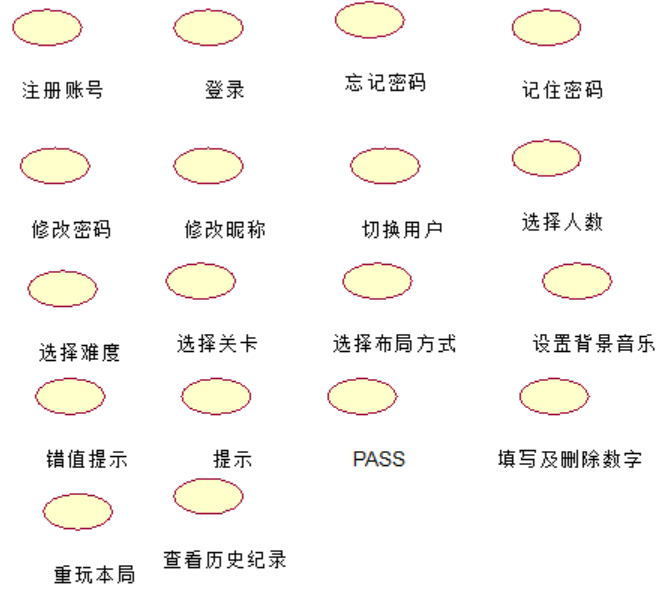 该九宫格数独游戏面向玩家,对于玩家来说功能需求如下:注册游戏账号,登录游戏,忘记密码,记住密码,密码修改,昵称修改,切换用户,选择游戏人数,选择游戏难度,选择游戏布局初始化方式,选择游戏关卡,设置游戏背景音乐,错值提示,PASS功能,重玩本局,填写及删除数字,提示,查看游戏历史记录等功能。