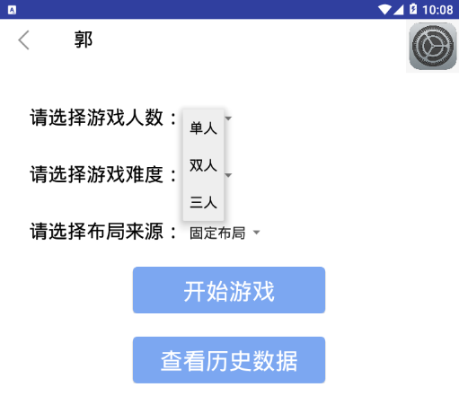 用户在登录成功后,在主界面可以选择开始游戏或者个人信息的修改,在选择开始游戏后就需要进行难度及游戏人数的选择,进入游戏后,相关的游戏提示根据用户是否需要进行选择后才提示,背景音乐的更换也在该模块完成;在个人信息模块,用户可修改密码,也可对历史数据进行查询。