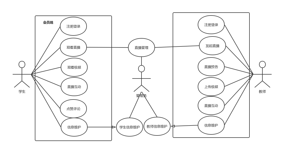 无论教师、教师,还是管理员均需要注册登录之后才能正常使用本系统,整个系统的运行主要由教师与教师组成,教师登录之后,通过发起直播向流媒体服务器进行推流操作,教师可以在安卓客户端看见该教师的直播间,点击进入直播间进行直播观看和聊天互动。教师也可以通过观看录播进行学习,管理员主要是可以对整个系统进行维护管理,包含对教师和教师的信息维护管理,对直播和视频的信息新增、修改等操作。此系统的系统用例图如图2.1: