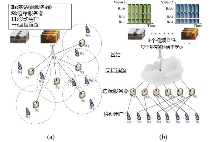关于内容缓存和分发问题,这些年来,已经取得了突破性的进展。随着全球移动流量的爆炸式增长和超密集异构网络的部署,对于连接在基站和核心网之间的回程链路而言,负载很大。为了提高回程链路可用性,解决其容量的性能瓶颈问题,研究者们提出向小型基站中引入缓存功能,这样就能在非流量高峰时期提前预取内容,当流量高峰时间终端用户发出请求后,能够为其提供高效的服务,在参考文献[11]中,作者提出了新的概念“FemtoCaching”,为了最小化用户的平均下载延迟,作者探讨了研究了异构蜂窝网络中的最优内容缓存和分发机制,为了处理一些高度可预测的例如VoD的庞大流量,可以将其缓存在移动边缘上,以此来减少回程链路中的消耗。参考文献[12]中,作者提出了一种小区合作式缓存策略,当缓存容量有限时,为了减少用户访问其所需内容时的平均时延。通过对问题的优化,作者提供了一个新的等价变换,并提出了使用一种复杂度较低且性能接近最优解的方法,得到缓存部署方案,以此来降低用户的请求延迟。在参考文献[13]中,作者观察了被多基站覆盖区域的情况,为了解决无线蜂窝网络中的内容缓存问题,并最大化用户请求所需内容的命中率,文中推导出最佳的缓存策略,实验结果表明,当区域被多基站覆盖时,采取标准的缓存策略,即将服务范围内最流行的内容缓存于各基站中,这种方案并不能得到系统上的性能提升。在参考文献[14]中,作者研究移动边缘缓存的基本信息理论极限,揭示延迟和缓存大小之间的最佳权衡问题。但是,所有上述研究仅关注一般的视频文件的缓存分配问题。而在参考文献[15]中,需要在边缘服务器中提前预期并确定适当的视频码率表示。