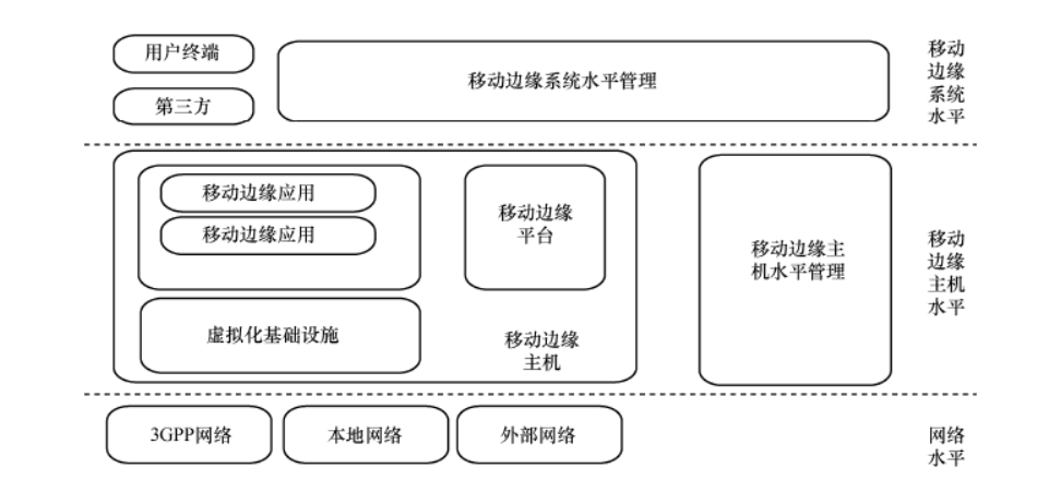 至于框架,在ESTI的白皮书中,对MEC的基本框架进行了定义,如图,可以看到图中有移动边缘系统水平、移动边缘主机水平和网络水平这三部分,这是对 MEC 下不同的功能实体进行了三个层次的划分[21]。