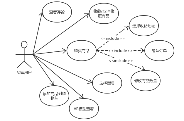 买家客户端:用户注册登录、商品搜索、商品详细信息浏览、商品收藏管理、商品购买、购物车系统、查看各状态订单、评价、用户地址管理、AR商品展示。