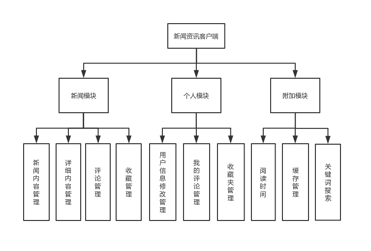 在用户启动该APP后,马上就可以看到当天最新的新闻。新闻被分成不同的栏目【8】让用户对自己感兴趣的资讯进行阅读。每个栏目会在主界面上显示每个栏目的新闻资讯信息。用户可以对自己感兴趣的新闻资讯发表自己的意见,也就是所谓的发表评论,其他的用户也能看到别人发表的评论,以此达到用户互相交流的效果,从而增强用户的交互体验感。此外,用户能修改自己的基本信息,包括用户名,密码,手机号等。