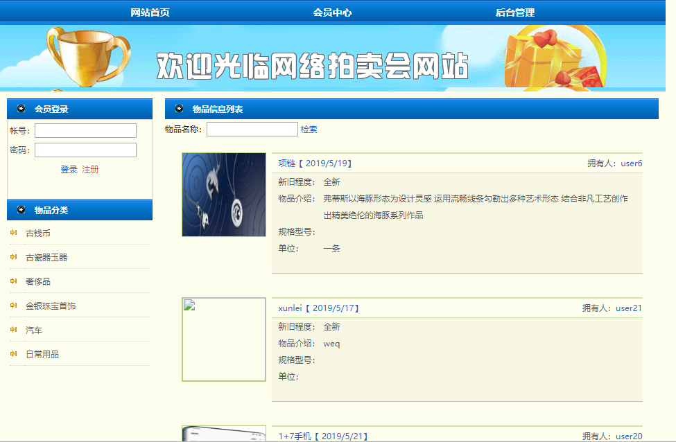 主要的研究内容就是网络拍卖平台的研究与开发,首先是对网络平台下的相关技术要有一个大概的了解,其次就是深入学习浏览器/服务器模式知识和SQL数据库相关技术操作,除此之外还要学习并掌握一些基本的“拍卖”相关的情况。网站按功能可以划分为两类角色:管理员和会员,管理员主要是对拍卖的整个流程进行控制,对参加拍卖的会员进行审核,以及拍卖完成处理和拍卖过程、拍卖状态查询。会员再注册后才可进行商品的上传、竞拍等具体操作。
