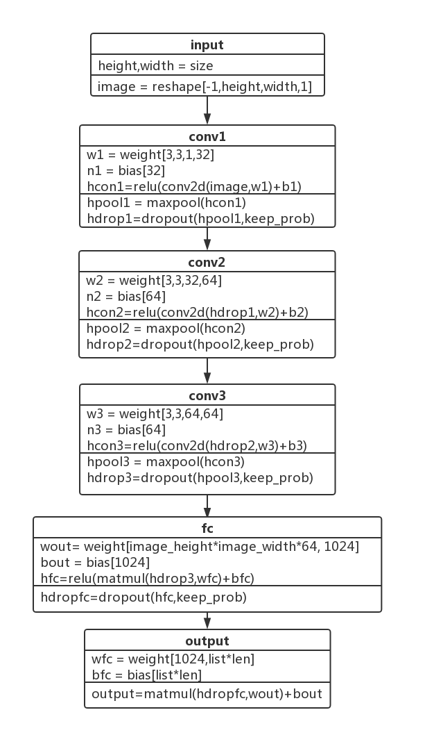(2) Based on the TensorFlow-GPU framework, a convolutional neural network model with three convolutional layers and a full connection layer is built to recognize captcha verification code recognition with an accuracy rate of 99%.